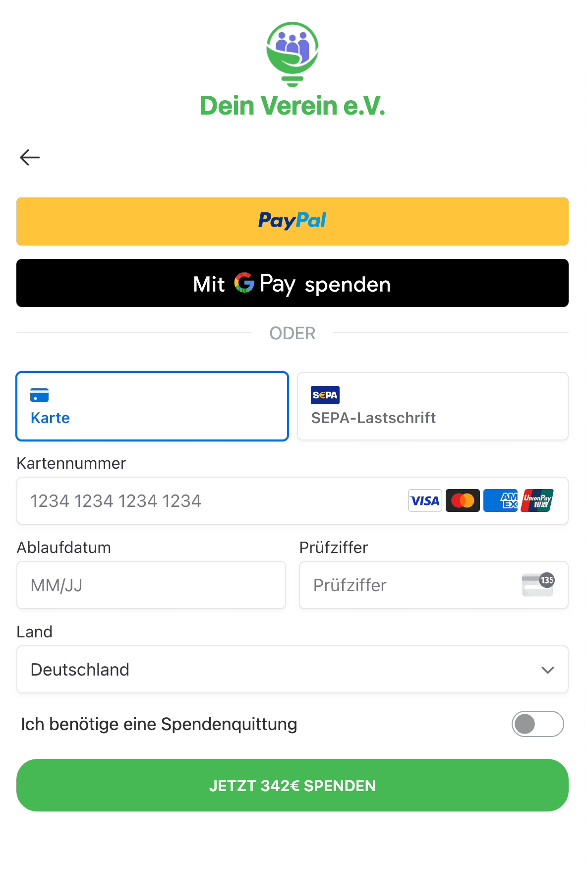 Mit Google Pay, Apple Pay, PayPal, Kreditkarte, Lastschrift und mehr, können deinen Unterstützer:innen Spenden wie sie wollen.